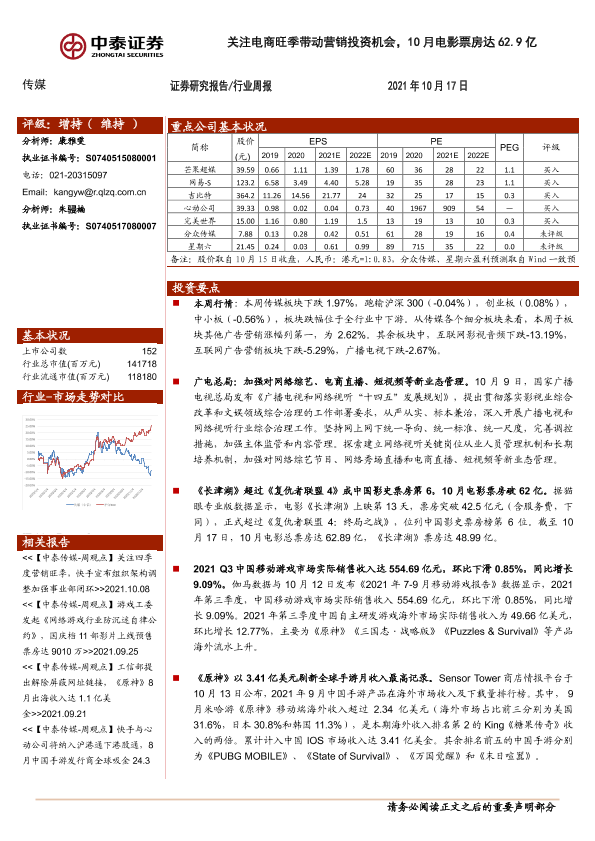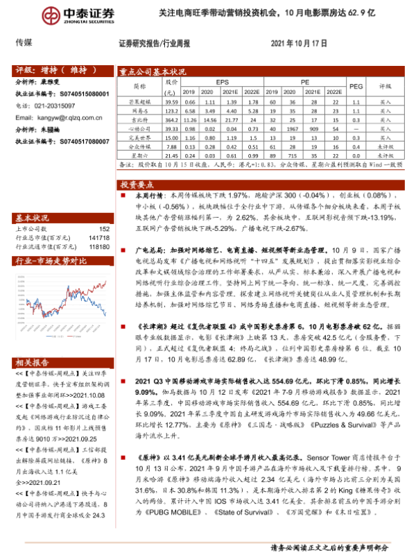 【中泰证券】【20211017】20211017-中泰证券-传媒行业周报:关注电商旺季带动营销投资机会,10月电影票房达62.9亿-12页