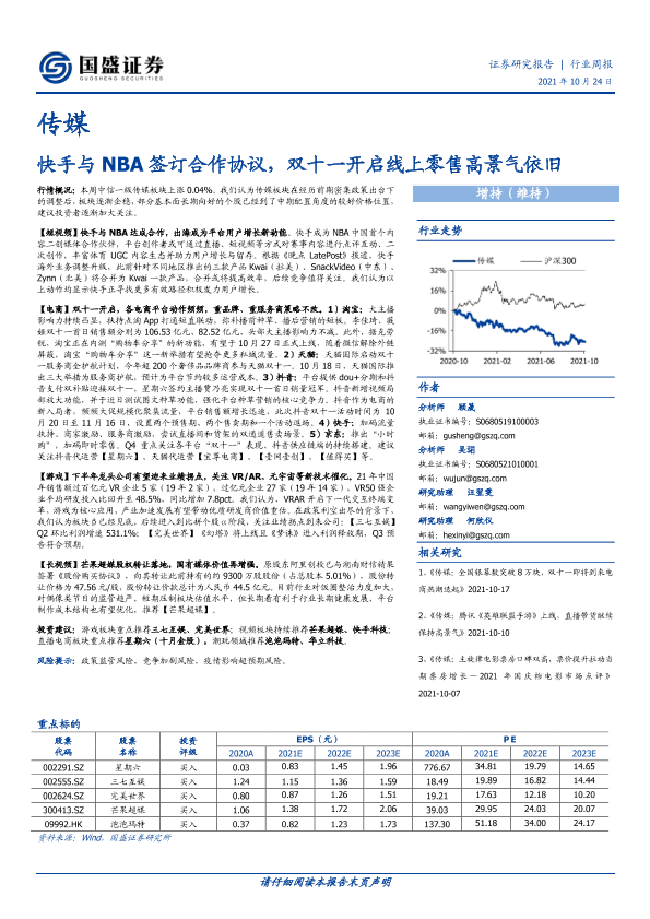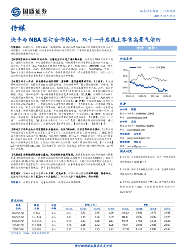 【国盛证券】【20211024】20211024-国盛证券-传媒行业周报:快手与NBA签订合作协议,双十一开启线上零售高景气依旧-16页