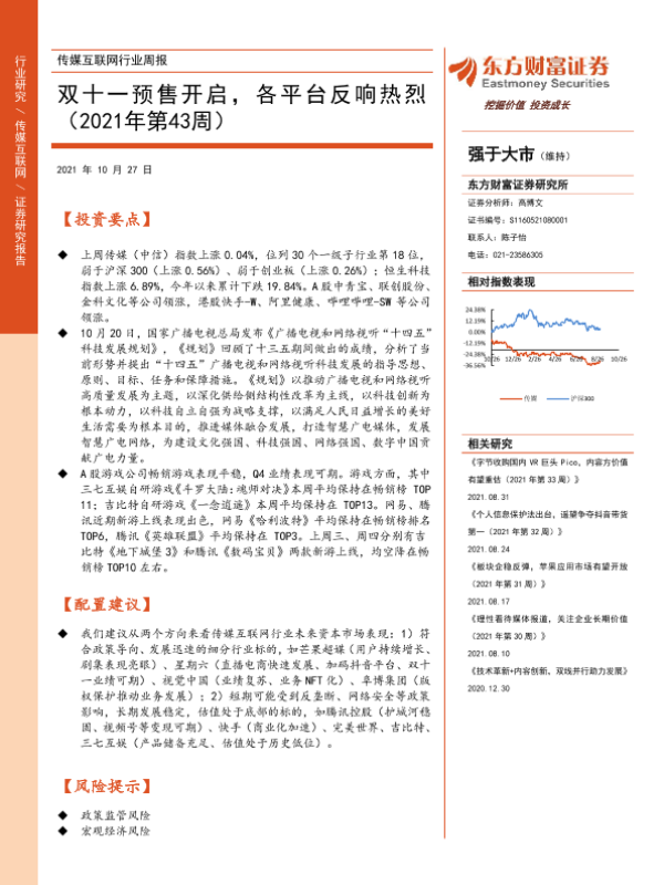 【东方财富证券】【20211027】20211027-东方财富证券-传媒互联网行业周报:双十一预售开启,各平台反响热烈(2021年第43周)-8页