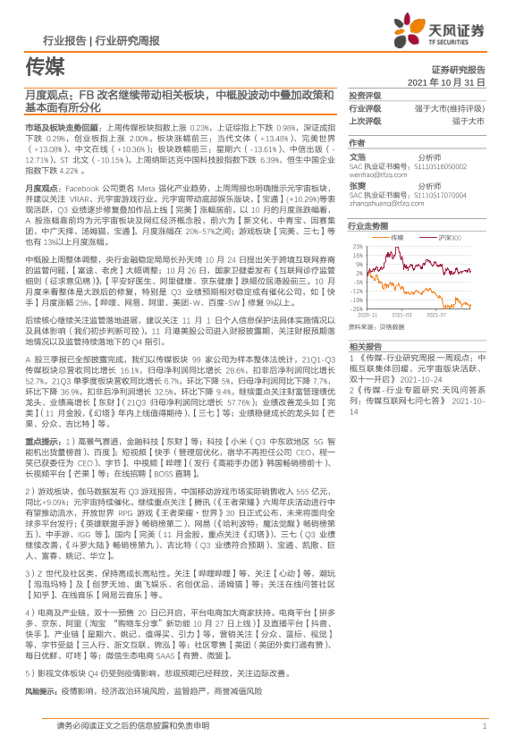 【天风证券】【20211031】20211031-天风证券-传媒月度观点:FB改名继续带动相关板块,中概股波动中叠加政策和基本面有所分化-15页