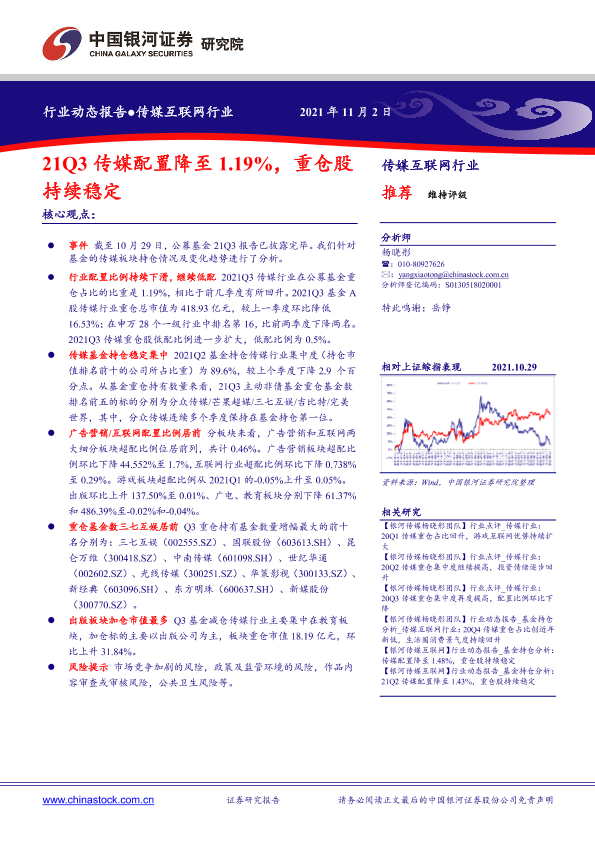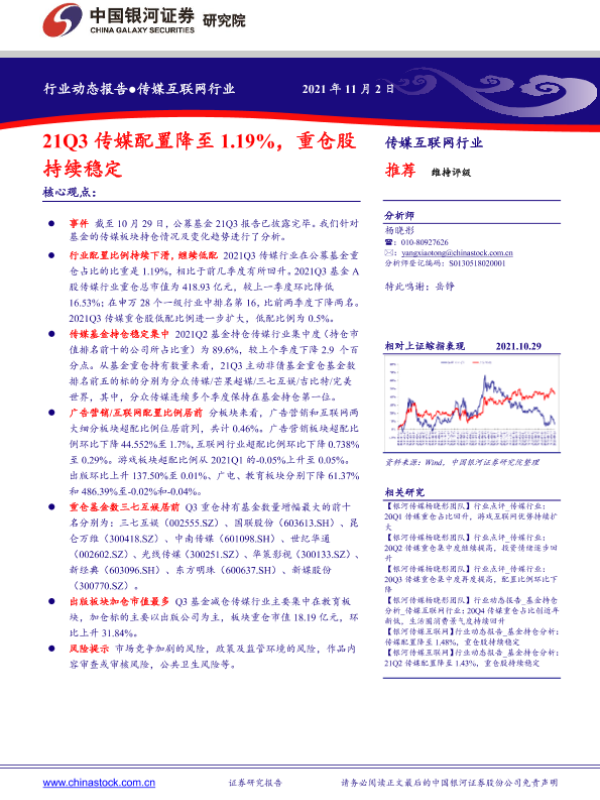 【银河证券】【20211102】20211102-中国银河-传媒互联网行业动态报告:21Q3传媒配置降至1.19%,重仓股持续稳定-11页