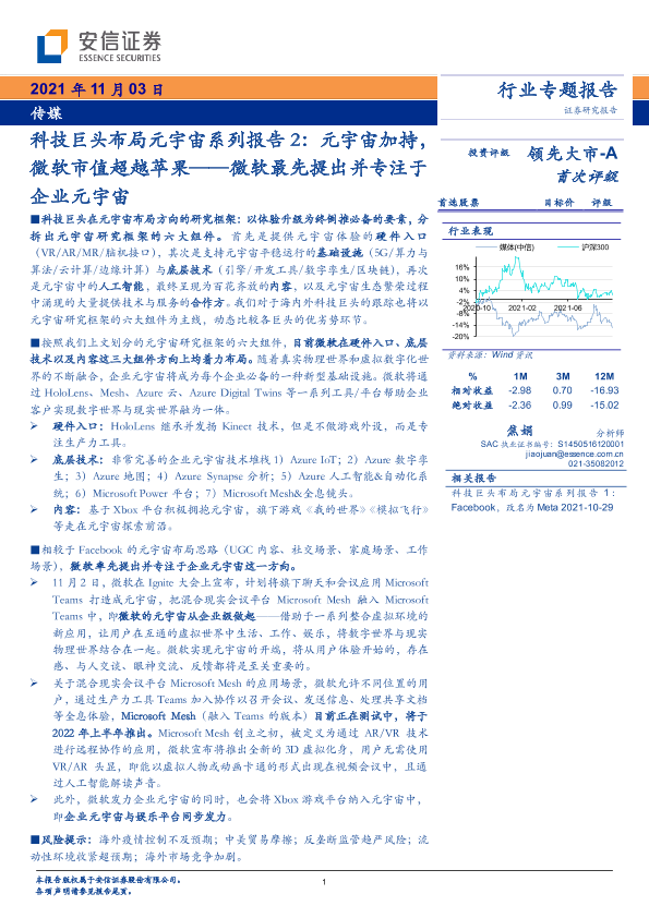 【安信证券】【20211103】科技巨头布局元宇宙系列报告2:元宇宙加持,微软市值超越苹果-微软最先提出并专注于企业元宇宙-11页