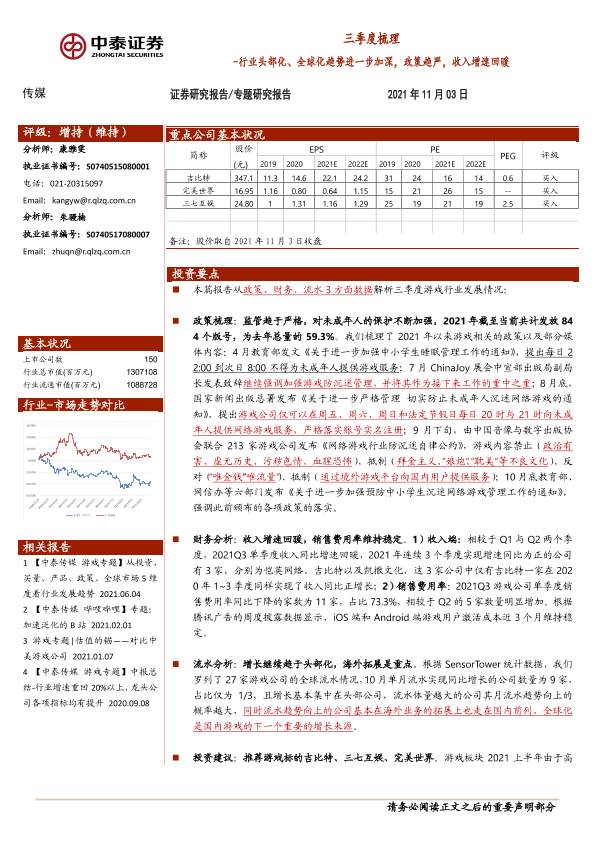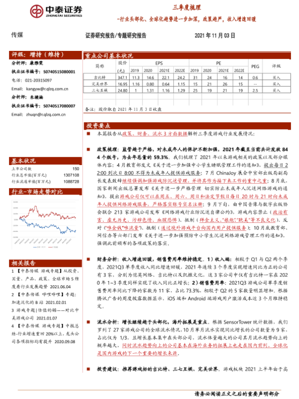 【中泰证券】【20211103】传媒三季度梳理:行业头部化、全球化趋势进一步加深,政策趋严,收入增速回暖-12页