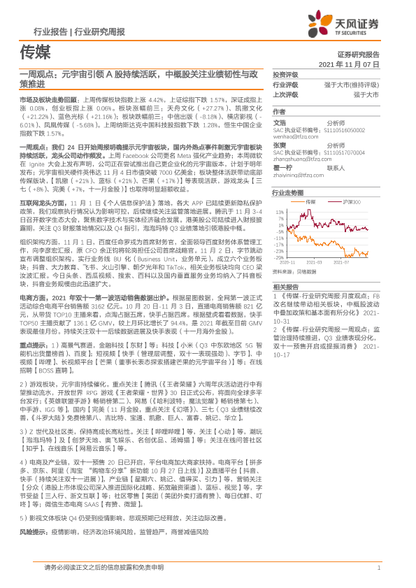 【天风证券】【20211107】20211107-天风证券-传媒行业研究周报:一周观点:元宇宙引领A股持续活跃,中概股关注业绩韧性与政策推进-16页