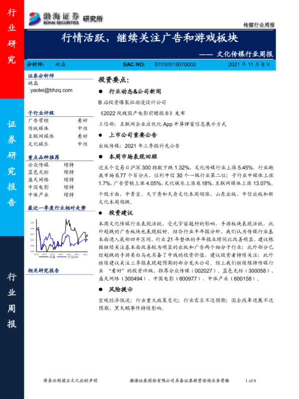 【渤海证券】【20211108】20211108-渤海证券-文化传媒行业周报:行情活跃,继续关注广告和游戏板块-8页