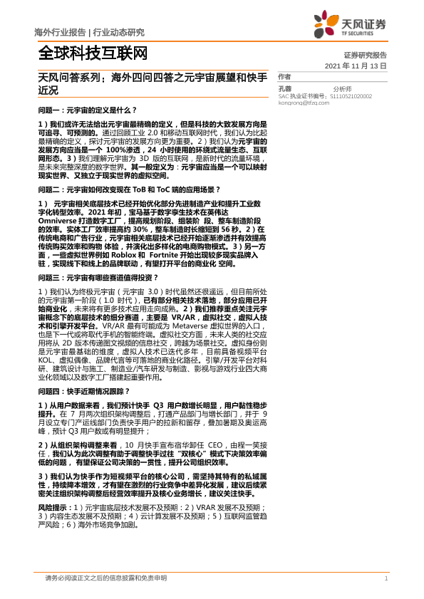 【天风证券】【20211113】天风问答系列:海外四问四答之元宇宙展望和快手近况-13页