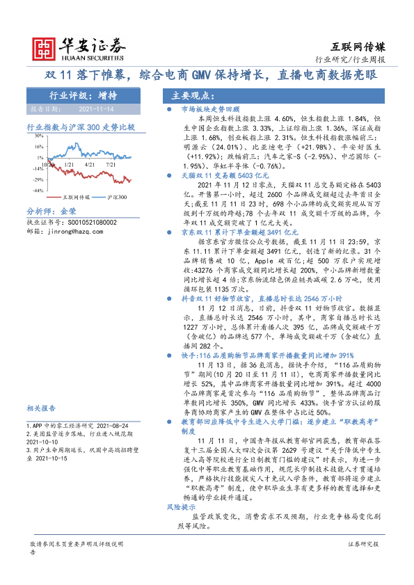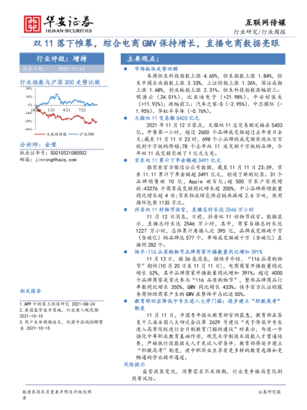 【华安证券】【20211114】20211114-华安证券-互联网传媒行业周报:双11落下帷幕,综合电商GMV保持增长,直播电商数据亮眼-15页