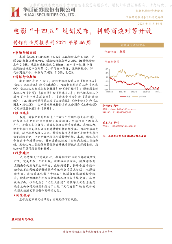 【华西证券】【20211114】20211114-华西证券-传媒行业周报系列2021年第46周:电影“十四五”规划发布,抖腾商谈对等开放-14页