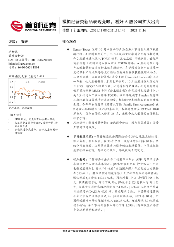 【首创证券】【20211116】20211116-首创证券-传媒行业周报:模拟经营类新品表现亮眼,看好A股公司扩大出海-11页