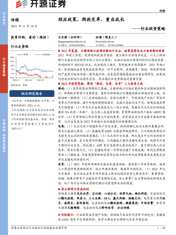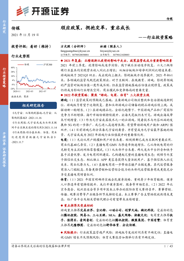【开源证券】【20211119】20211119-开源证券-传媒行业投资策略:顺应政策,拥抱变革,重启成长-43页