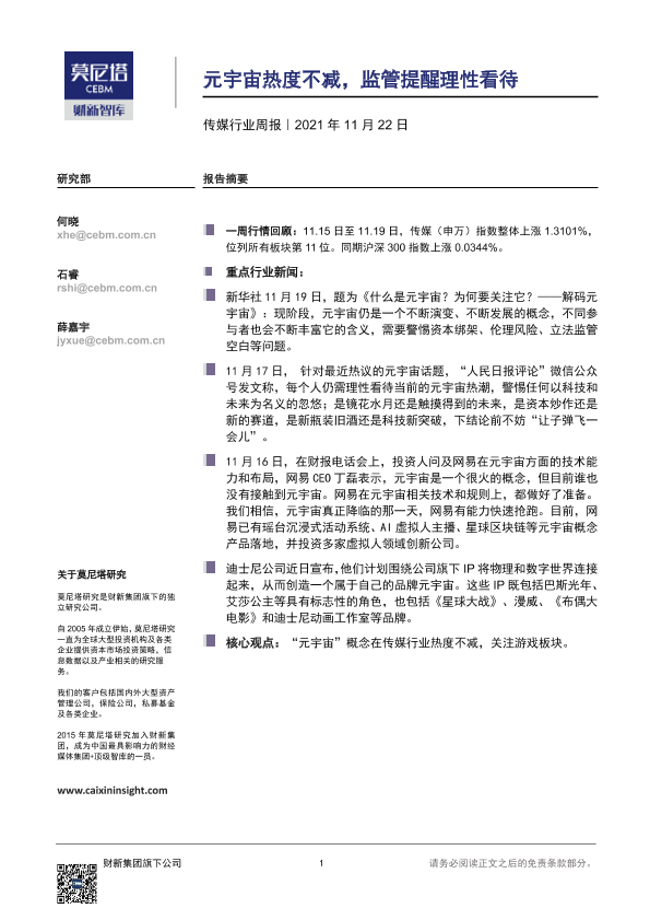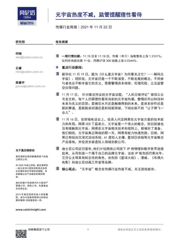 【莫尼塔研究】【20211122】20211122-莫尼塔投资-传媒行业周报:元宇宙热度不减,监管提醒理性看待-8页