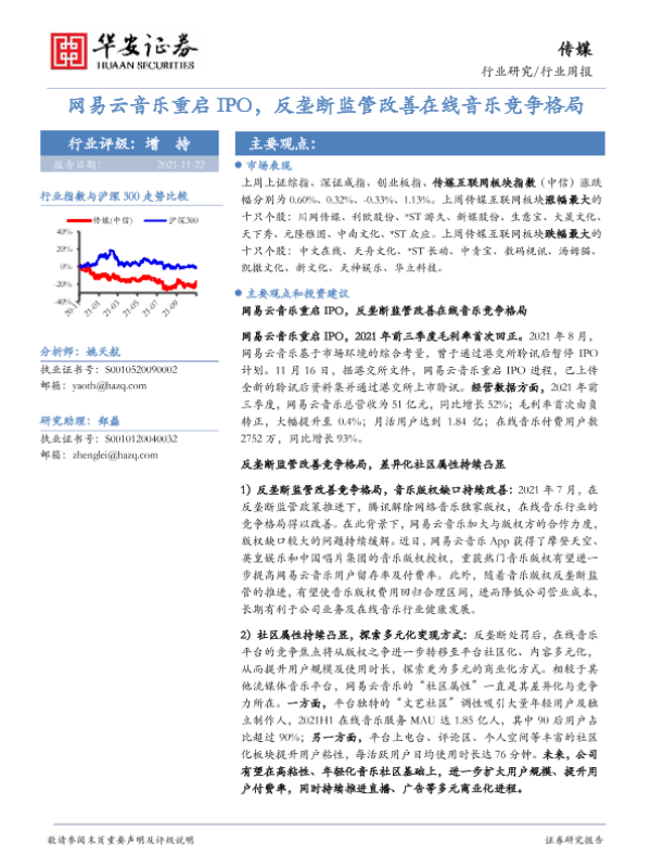 【华安证券】【20211122】20211122-华安证券-传媒行业周报:网易云音乐重启IPO,反垄断监管改善在线音乐竞争格局-18页