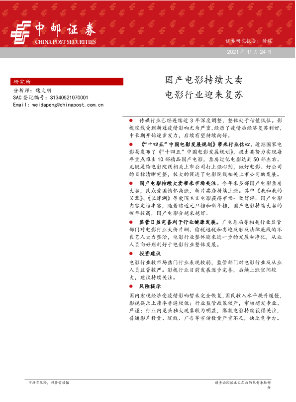 【中邮证券】【20211124】国产电影持续大卖 电影行业迎来复苏-4页