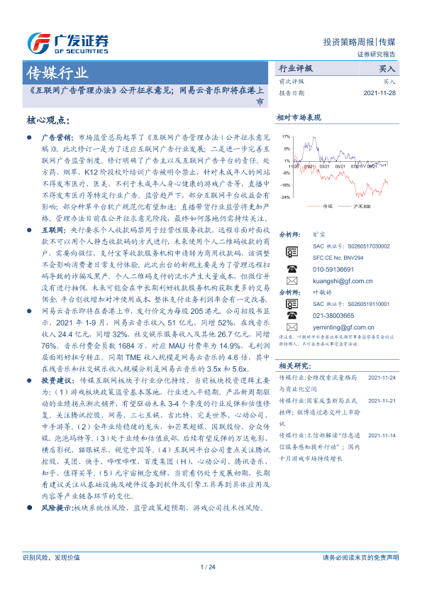 【广发证券】【20211128】20211128-广发证券-传媒行业:《互联网广告管理办法》公开征求意见;网易云音乐即将在港上市-24页