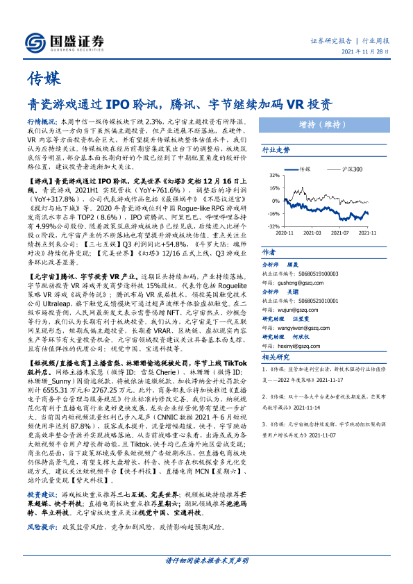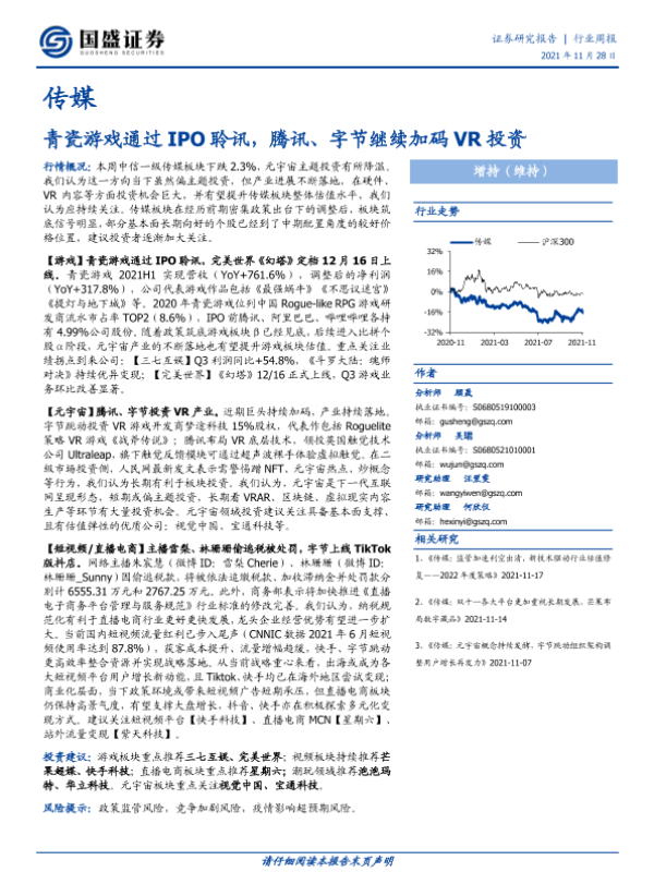 【国盛证券】【20211128】20211128-国盛证券-传媒行业周报:青瓷游戏通过IPO聆讯,腾讯、字节继续加码VR投资-15页