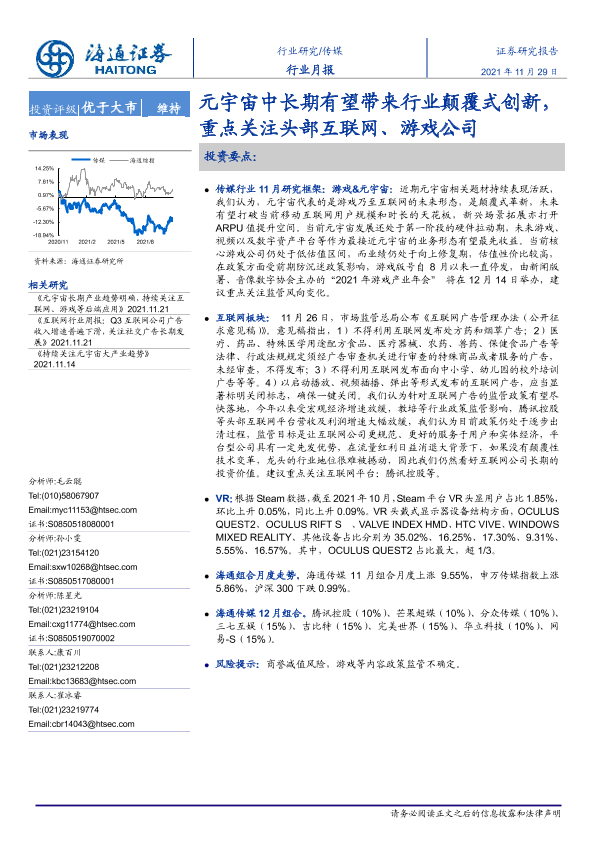 【海通证券】【20211129】20211129-海通证券-传媒行业月报:元宇宙中长期有望带来行业颠覆式创新,重点关注头部互联网、游戏公司-12页