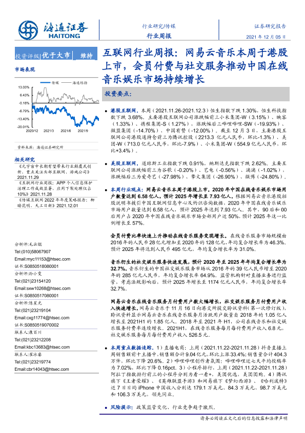 【海通证券】【20211205】20211205-海通证券-互联网行业周报:网易云音乐本周于港股上市,会员付费与社交服务推动中国在线音乐娱乐市场持续增长-10页