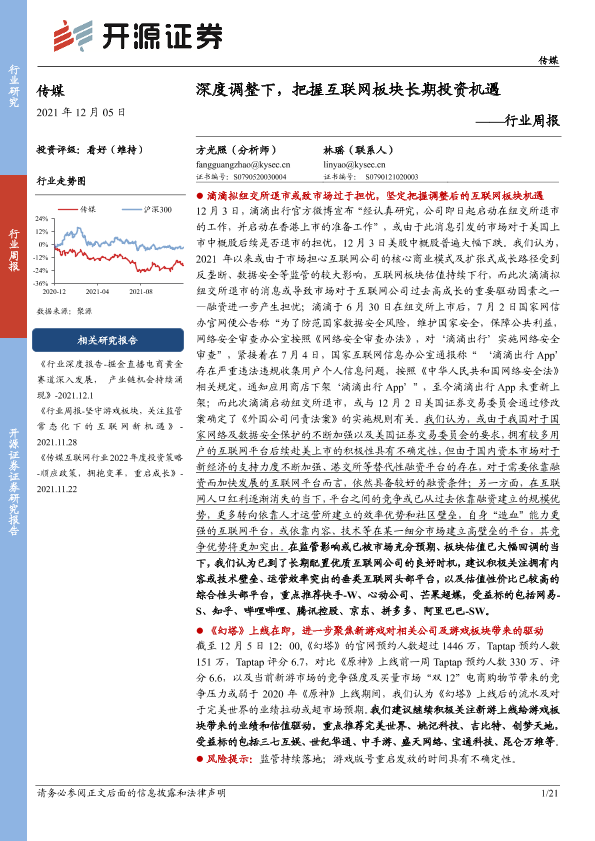 【开源证券】【20211205】20211205-开源证券-传媒行业周报:深度调整下,把握互联网板块长期投资机遇-21页