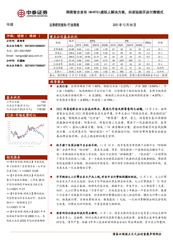 【中泰证券】【20211205】20211205-中泰证券-传媒行业周报:网易智企发布IM+RTC+虚拟人解决方案,抖音短剧开启付费模式-13页