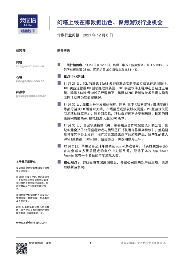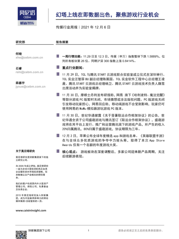 【莫尼塔研究】【20211206】20211206-莫尼塔投资-传媒行业周报:幻塔上线在即数据出色,聚焦游戏行业机会-8页