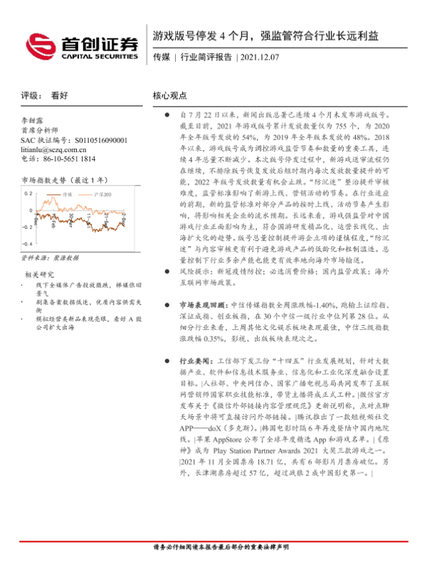 【首创证券】【20211207】20211207-首创证券-传媒行业简评报告:游戏版号停发4个月,强监管符合行业长远利益-11页