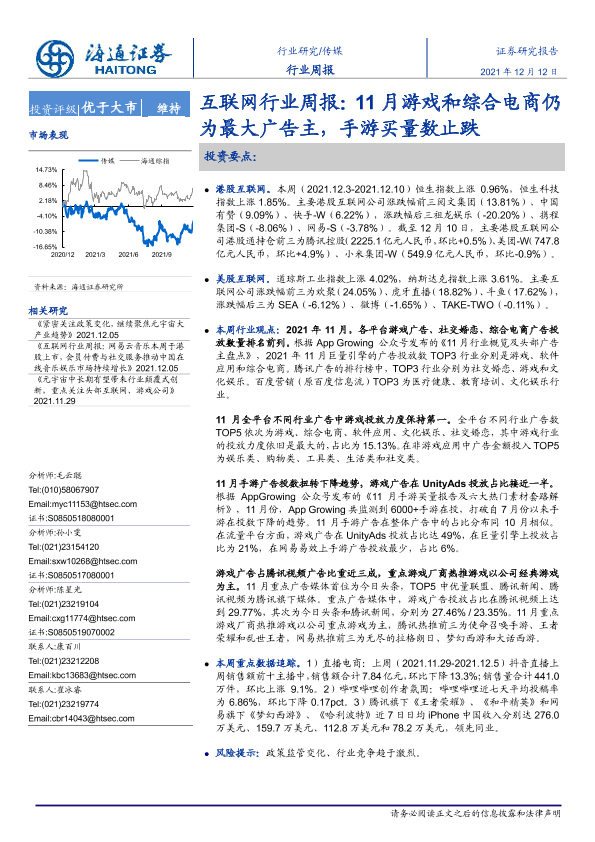 【海通证券】【20211212】20211212-海通证券-互联网行业周报:11月游戏和综合电商仍为最大广告主,手游买量数止跌-9页