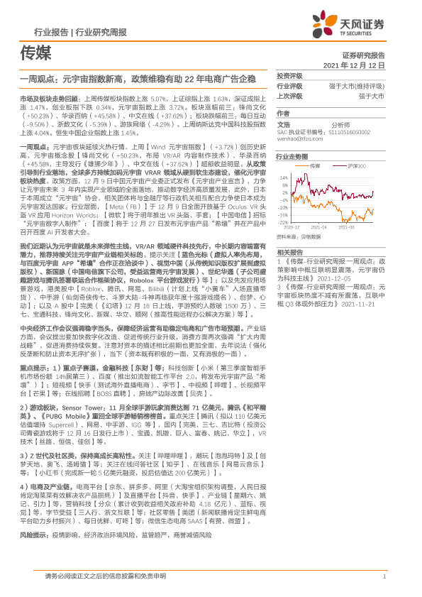 【天风证券】【20211212】传媒一周观点:元宇宙指数新高,政策维稳有助22年电商广告企稳-15页