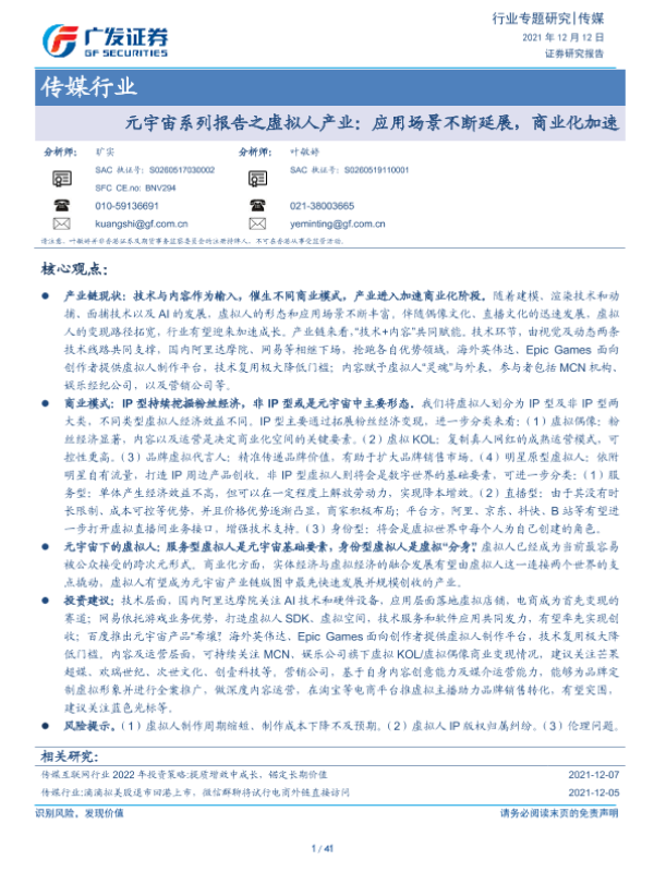 【广发证券】【20211212】元宇宙系列报告之虚拟人产业:应用场景不断延展,商业化加速-41页