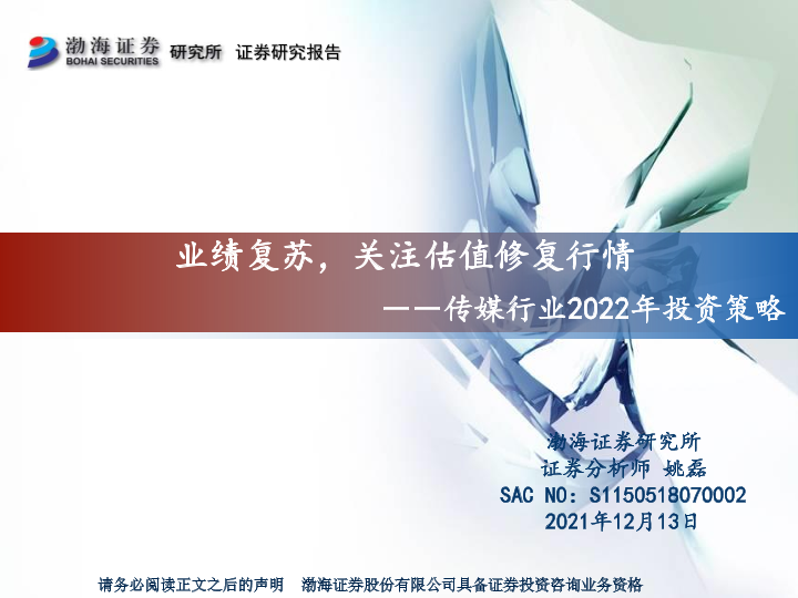 【渤海证券】【20211213】传媒行业2022年投资策略:业绩复苏,关注估值修复行情-23页