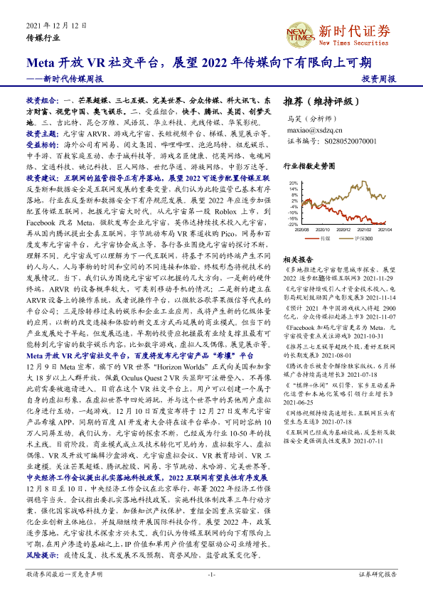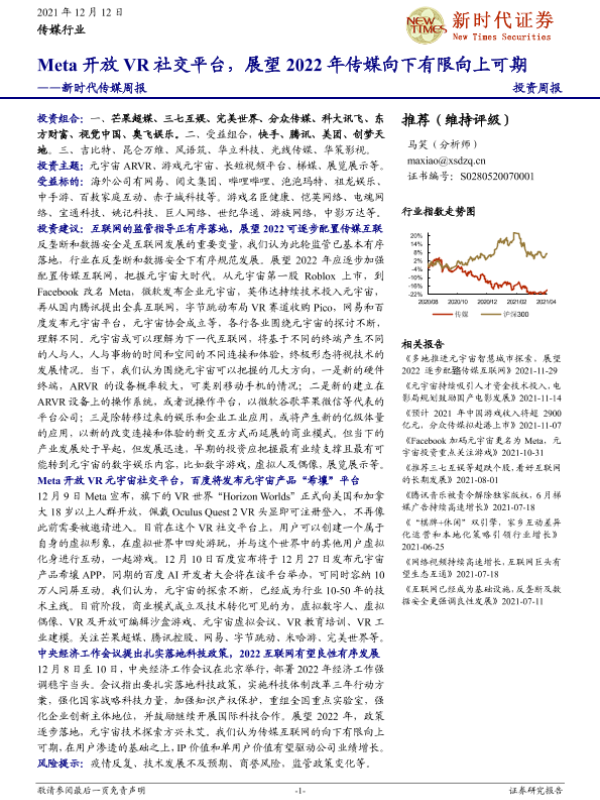 【新时代证券】【20211212】新时代证券-新时代传媒周报:Meta开放VR社交平台,展望2022年传媒向下有限向上可期-31页