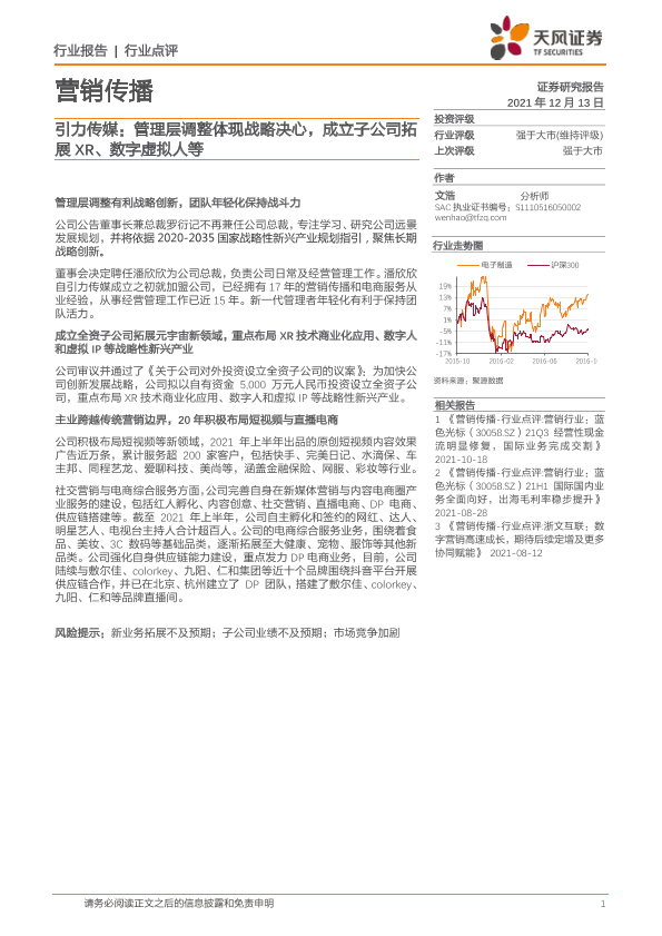 【天风证券】【20211213】营销传播行业点评:引力传媒:管理层调整体现战略决心,成立子公司拓展XR、数字虚拟人等-2页