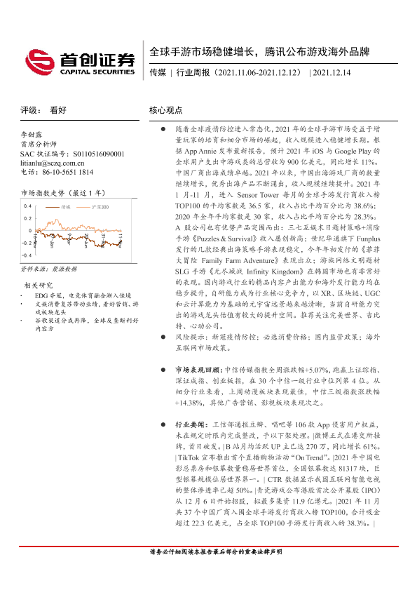 【首创证券】【20211214】20211214-首创证券-传媒行业周报:全球手游市场稳健增长,腾讯公布游戏海外品牌-12页
