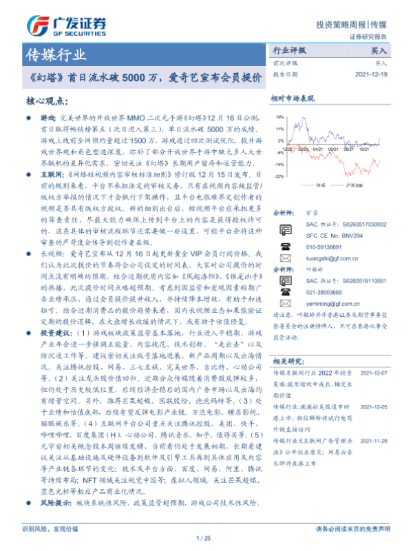 【广发证券】【20211219】20211219-广发证券-传媒行业投资策略周报:《幻塔》首日流水破5000万,爱奇艺宣布会员提价-25页
