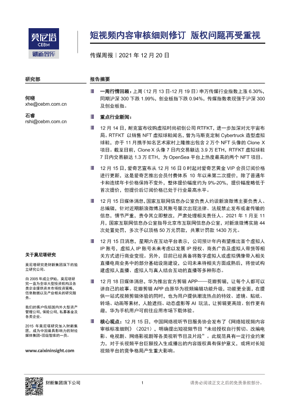 【莫尼塔研究】【20211220】20211220-莫尼塔投资-传媒周报:短视频内容审核细则修订 版权问题再受重视-7页