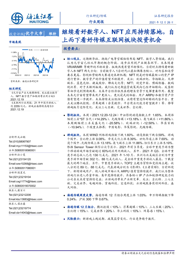 【海通证券】【20211226】20211226-海通证券-传媒行业周报:继续看好数字人、NFT应用持续落地,自上而下看好传媒互联网板块投资机会-11页