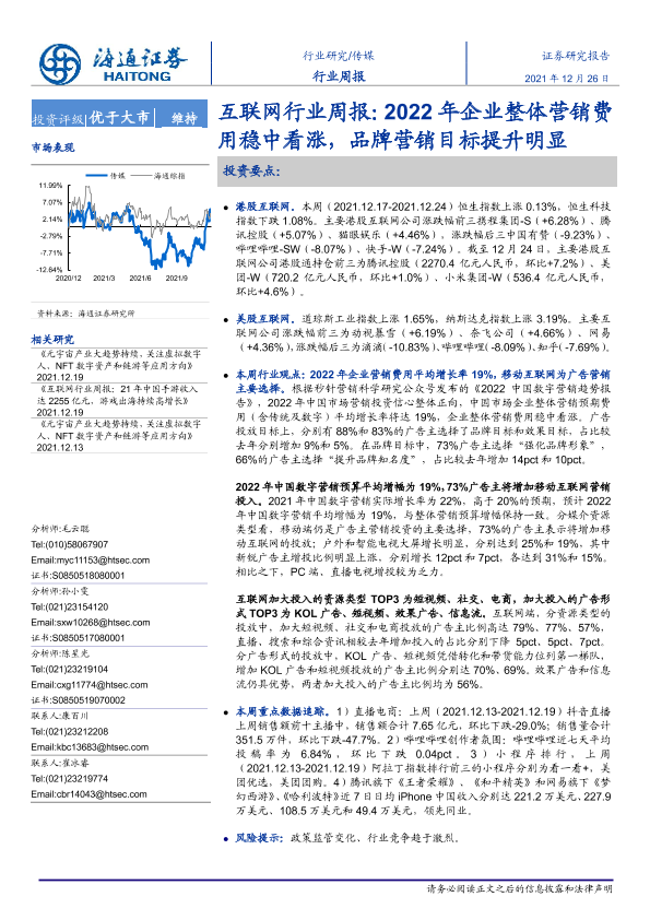 【海通证券】【20211226】20211226-海通证券-互联网行业周报:2022年企业整体营销费用稳中看涨,品牌营销目标提升明显-9页