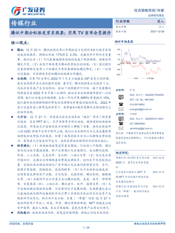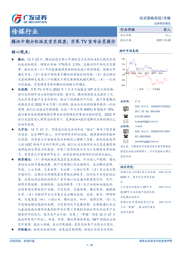 【广发证券】【20211226】传媒行业:腾讯中期分红派发京东股票;芒果TV宣布会员提价-24页