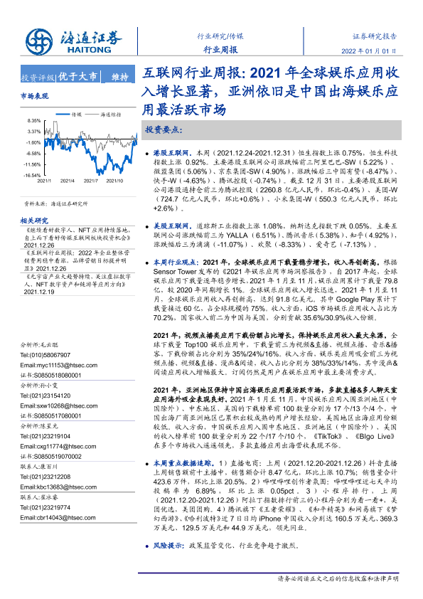 【海通证券】【20220101】20220101-海通证券-互联网行业周报:2021年全球娱乐应用收入增长显著,亚洲依旧是中国出海娱乐应用最活跃市场-10页