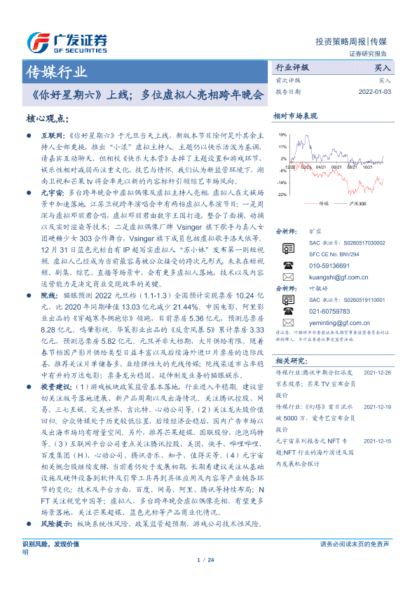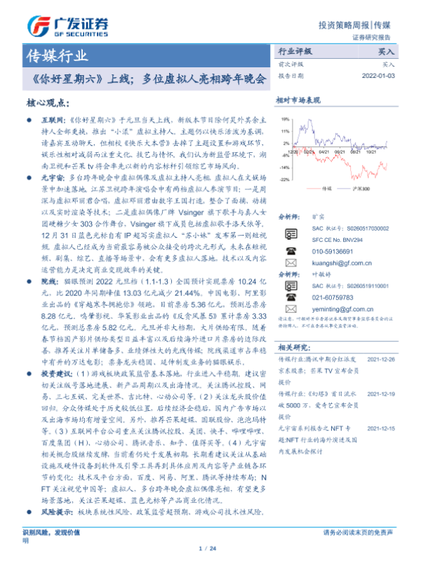 【广发证券】【20220103】20220103-广发证券-传媒行业投资策略周报:《你好星期六》上线;多位虚拟人亮相跨年晚会-24页