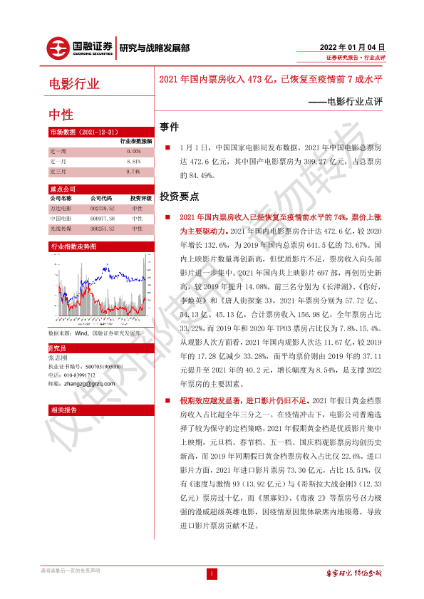 【国融证券】【20220104】电影行业点评:2021年国内票房收入473亿,已恢复至疫情前7成水平-3页