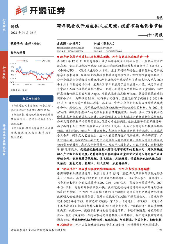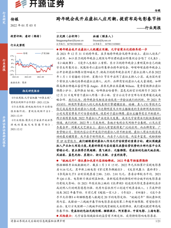 【开源证券】【20220103】20220103-开源证券-传媒行业周报:跨年晚会或开启虚拟人应用潮,提前布局电影春节档-21页