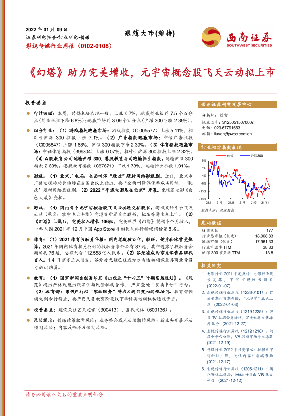 【西南证券】【20220109】20220109-西南证券-影视传媒行业周报:《幻塔》助力完美增收,元宇宙概念股飞天云动拟上市-18页