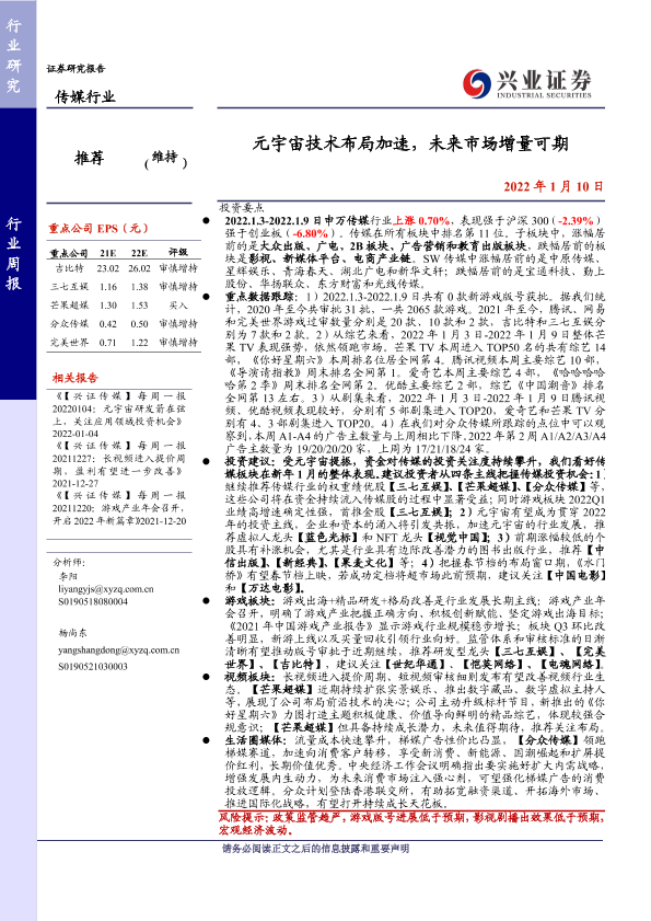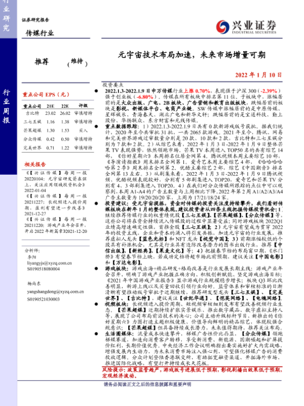 【兴业证券】【20220110】20220110-兴业证券-传媒行业周报:元宇宙技术布局加速,未来市场增量可期-19页