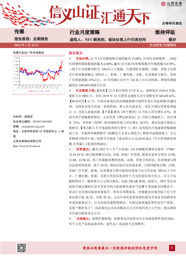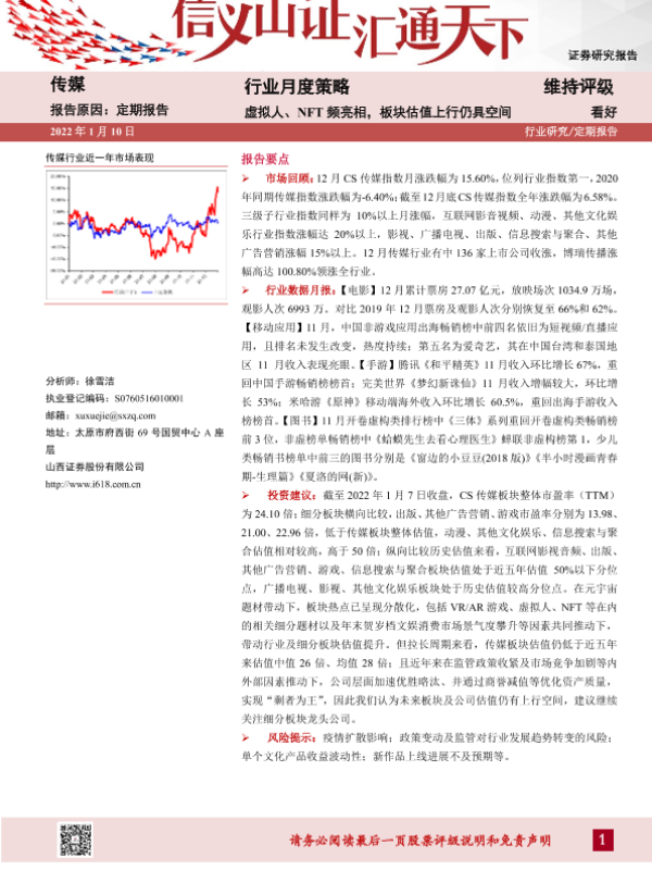 【山西证券】【20220110】20220110-山西证券-传媒行业月度策略:虚拟人、NFT频亮相,板块估值上行仍具空间-24页