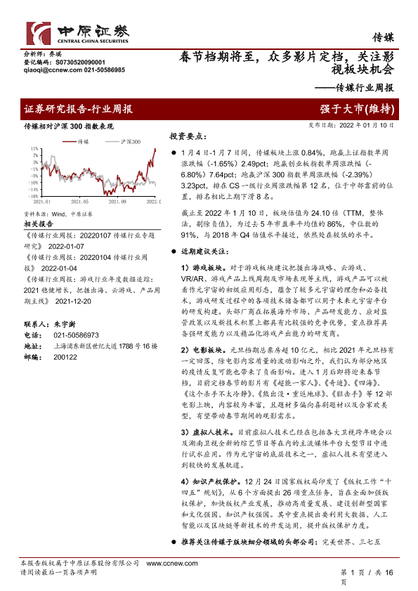 【中原证券】【20220110】20220110-中原证券-传媒行业周报:春节档期将至,众多影片定档,关注影视板块机会-16页