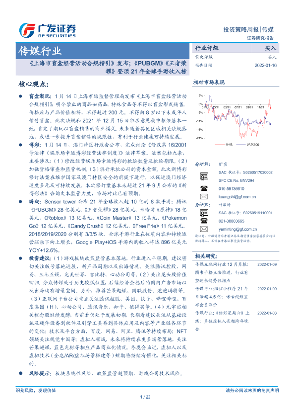【广发证券】【20220116】传媒行业:《上海市盲盒经营活动合规指引》发布;《PUBGM》《王者荣耀》登顶21年全球手游收入榜-23页