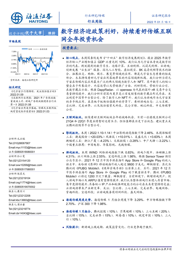 【海通证券】【20220116】传媒行业周报:数字经济迎政策利好,持续看好传媒互联网全年投资机会-10页