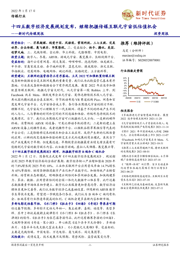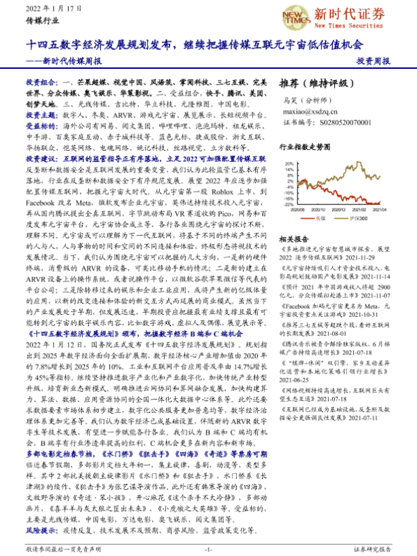 【新时代证券】【20220117】十四五数字经济发展规划发布,继续把握传媒互联元宇宙低估值机会-30页