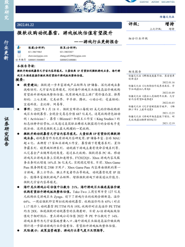 【国泰君安证券】【20220122】游戏行业更新报告:微软收购动视暴雪,游戏板块估值有望提升-10页