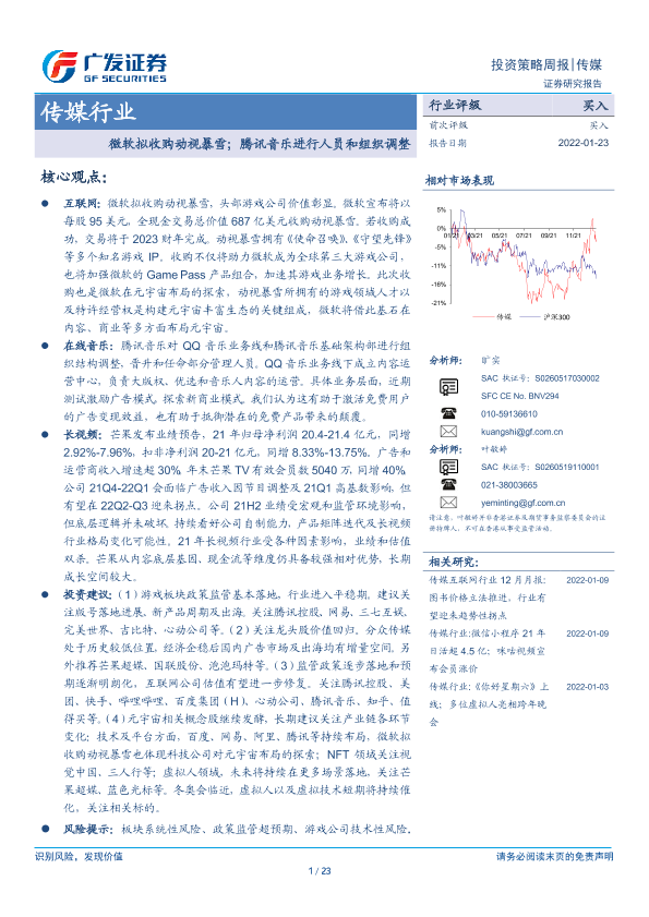 【广发证券】【20220123】传媒行业:微软拟收购动视暴雪;腾讯音乐进行人员和组织调整-23页